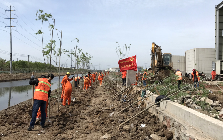 427日,鮮紅的黨旗在開發區開泰河的上空高高飄揚,黑褐色的土地上,處處綻放著“橘黃色的花朵”,那是身著工服的“華茂人”忘我忙碌的身影。為確保開泰河綠化景觀工程項目按期完工,華茂機關全體職工、分公司部分職工80余人,主動放棄休息日,加入“工程大軍”中,高效助力開泰河綠化工程在既定工期內順利完工,為創建文明城市增添一份靚麗的色彩。開泰河邊人頭攢動,大家擼起衣袖,拿起鐵鍬,挖坑、運苗、栽苗、培土,相互配合,干勁十足。汗水混合著沙土沾滿了頭上、臉上、手套、衣服和鞋子上,卻沒有一人叫苦叫累。經過大家奮力趕工,一天時間,一顆顆大樹苗筆直、整齊劃一的“站立”在開泰河的兩岸,放眼望去,黑褐色的土地上點點綠意,綻放出了片片生機。