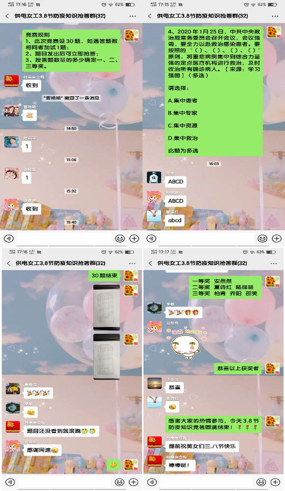 2020年第110個國際“三八”婦女節來臨之際,為了讓公司女職工在做好自身疫情防護的前提下,能夠度過一個健康、愉快、充實的節日,公司女工委利用微信群組織全體女職工開展了慶“三八”抗新冠疫情防護知識搶答賽活動。