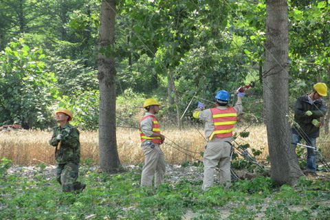 施工現場地形復雜,跨越路口8處、河線4處、通訊線光纜5處、10KV和0.4KV帶電線路7處,蝦塘10處。公司統一調度,分工協作,同步展開。在施工現場,指定了專職安全員,各道路、線路跨越處搭設了防護架,設置了臨時警示牌和警示欄,收緊線過程中進行巡線,確保施工安全。中午,公司在淮鹽大酒店制作工作簡餐,送到工地,施工人員抽空輪流進餐后,就繼續接著施工,并一直忙到晚上9點。