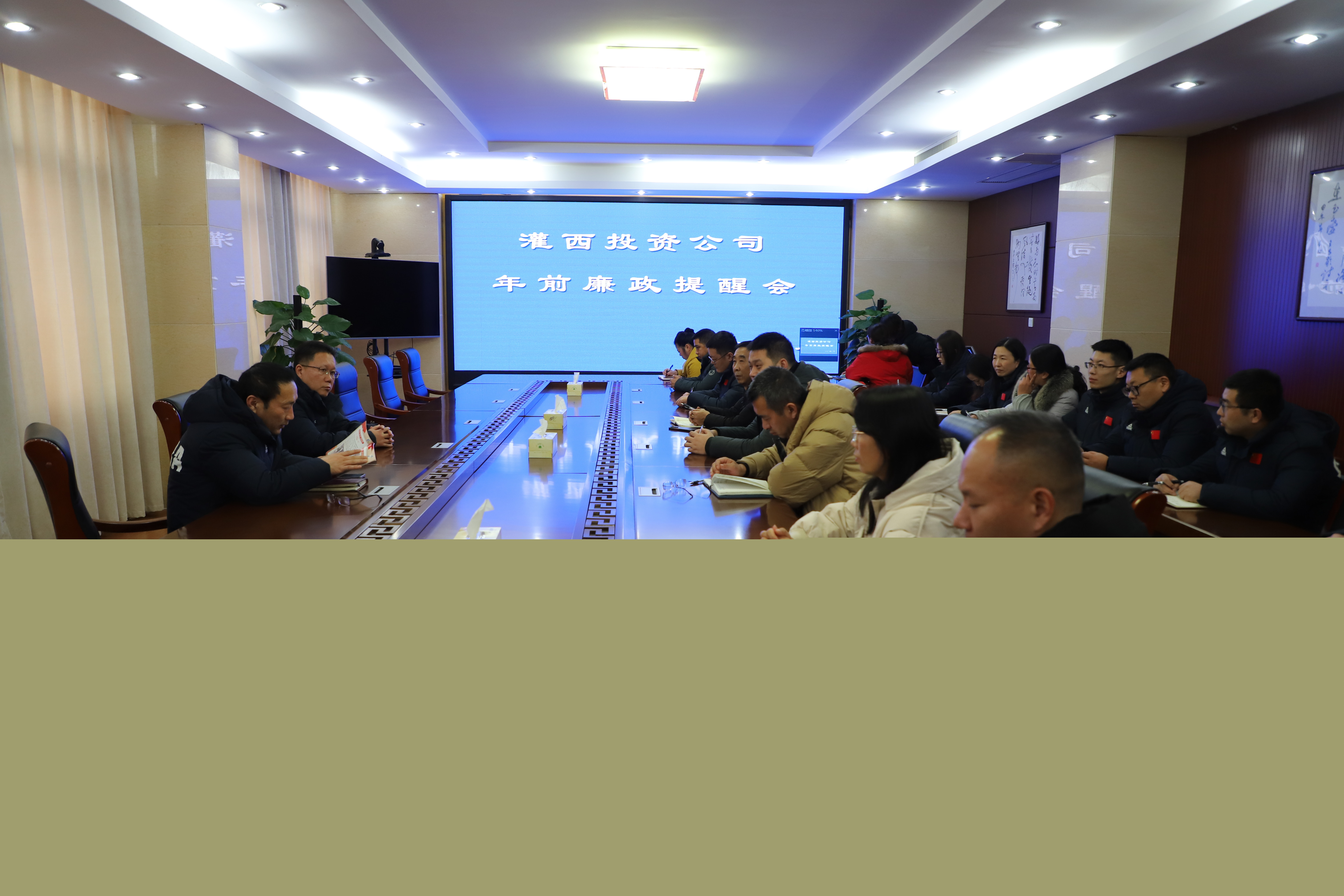 新春佳節將至,為加固中央八項規定堤壩,持續釋放從嚴信號,營造風清氣正節日氛圍,2月4日,灌西投資公司紀委組織召開年前廉政提醒會,灌西公司紀委書記王克平出席會議,公司紀委副書記張建保主持會議,部門負責人及關鍵崗位人員參加會議。