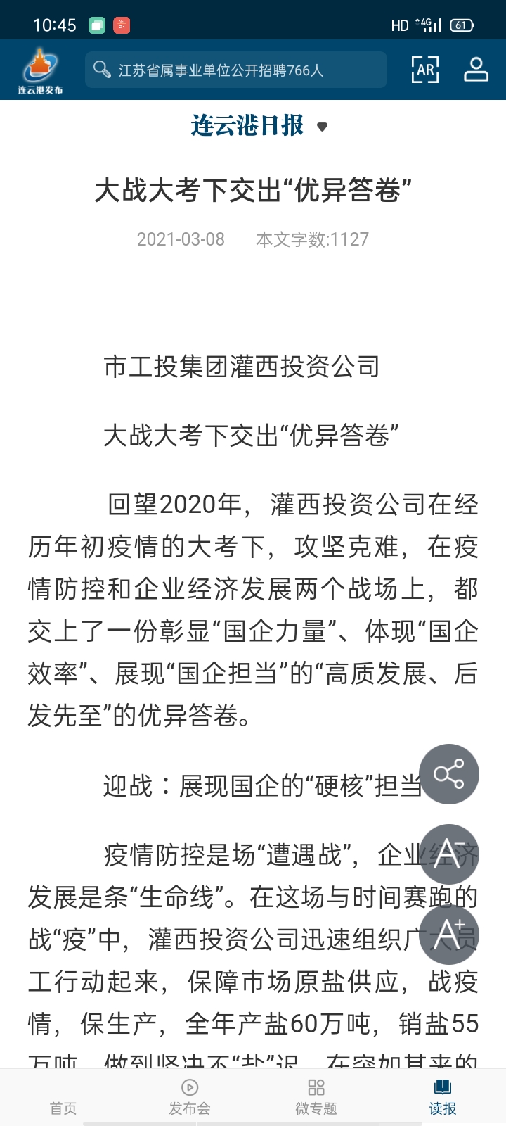 疫情防控是場“遭遇戰”,企業經濟發展是條“生命線”。在這場與時間賽跑的戰“疫”中,灌西投資公司迅速組織廣大員工行動起來,保障市場原鹽供應,戰疫情,保生產,全年產鹽60萬噸,銷鹽55萬噸,做到堅決不“鹽”遲。在突如其來的疫情大考面前,通過在“家門口”搭建招聘平臺,“點對點”推送用工信息,為應聘人員“量身”定崗,招聘因疫情管控失業人員83人,同時為臨港產業區輸送轉崗職工70余人,讓因疫情管控還沒有出門打工的灌西社區本地人員在家門口上班,穩住了復工復產的“陣腳”,以“硬核”擔當,護航企業經濟復蘇。