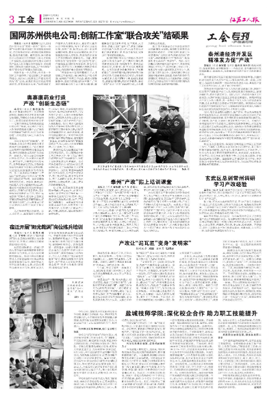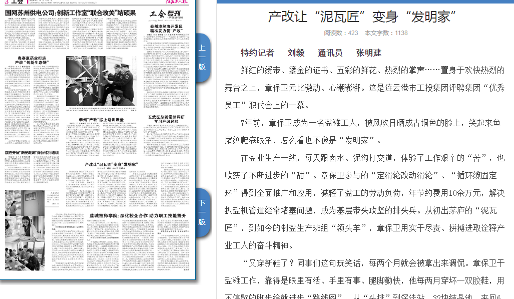 12月9日,《江蘇工人報》第三版刊登灌西公司產改故事:產改讓“泥瓦匠”變身“發明家”