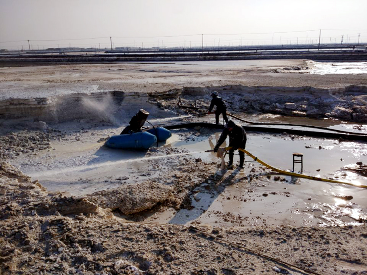 來到埒南制鹽分公司6班硫酸鈣清理現場,只見水槍里射出的水柱把硫酸鈣廢渣沖的四處飛濺,伴隨機器轟鳴聲硫酸鈣廢液被送出灘外,工友們穿好雨衣,戴好頭盔,手握水槍,一站就是3、4個小時,他們兩人一組,輪番作業,確保息人不息機。班長胡繼華信誓旦旦的說我們要發揚一不怕苦,二不怕累的革命精神,發揚“有條件要上,沒有條件創造條件也要上”的大慶精神,寧愿多加班,少睡覺也要按期保證完成硫酸鈣清理工作。