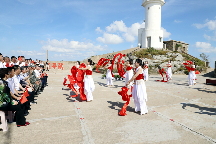 10點35分,升國旗平臺成了簡易舞臺,慰問演出在舞蹈《紅紅火火大中國》中開始,為開山島增添了節日的氛圍,百名黨員一起和唱了《我的祖國》一同迎接國慶節的到來。隨后在實境課堂一起觀看了《孤島32年》,通過影片學習王繼才同志對黨忠誠、矢志報國的政治品格,學習他一諾千金、終身不悔的樸素情懷,學習他立足平凡、追求崇高的人生境界,學習他扎實工作、默默無聞的奉獻精神。