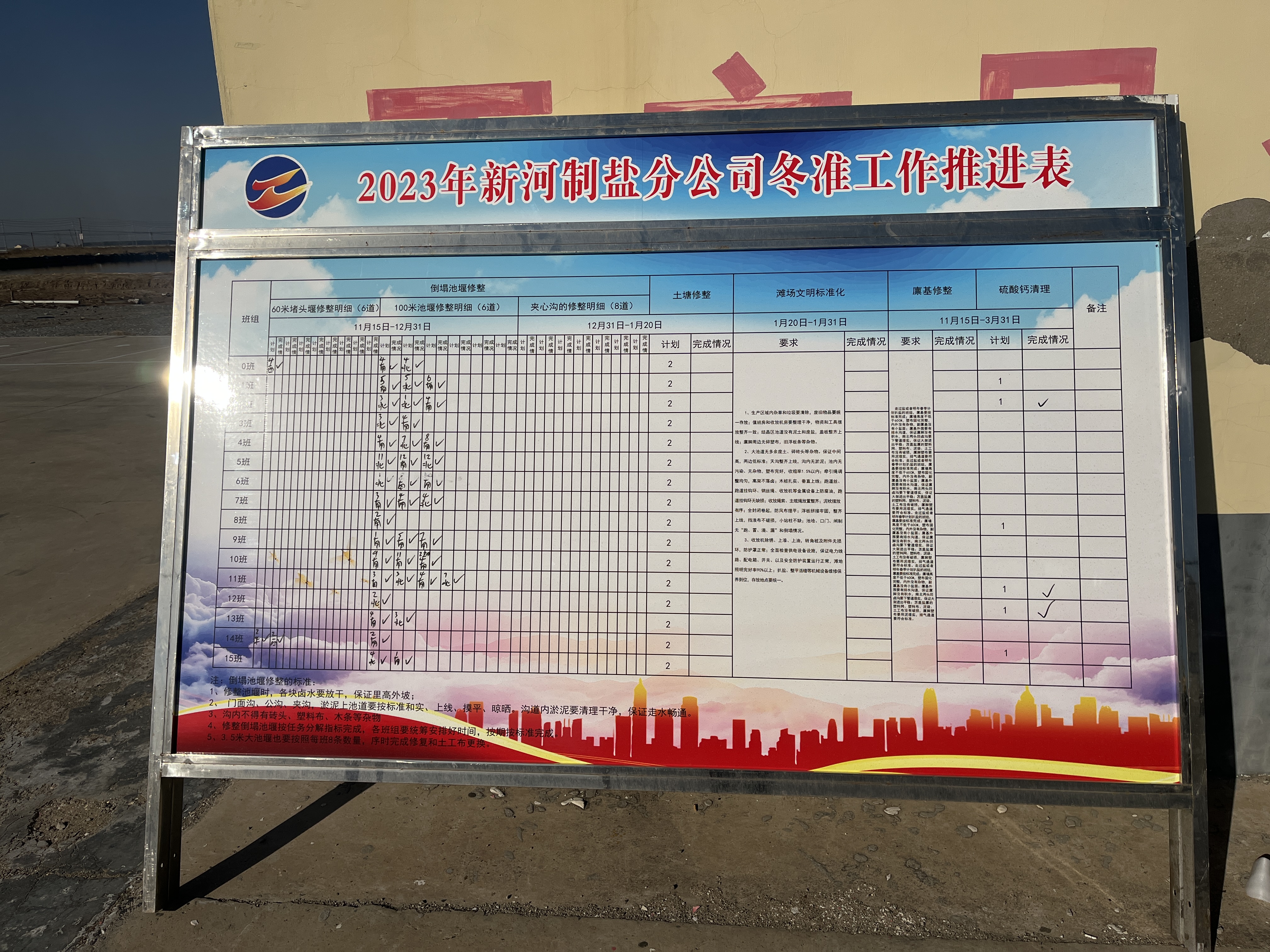冬季是日曬制鹽收儲鹵水、扒土塘、整理灘場文明的最佳時期,也是為2024年工作起好頭、邁好步的關鍵時期,自冬準工作開展以來,新河制鹽分公司制定冬準工作推進表,掛圖作戰按時推進冬準進度。