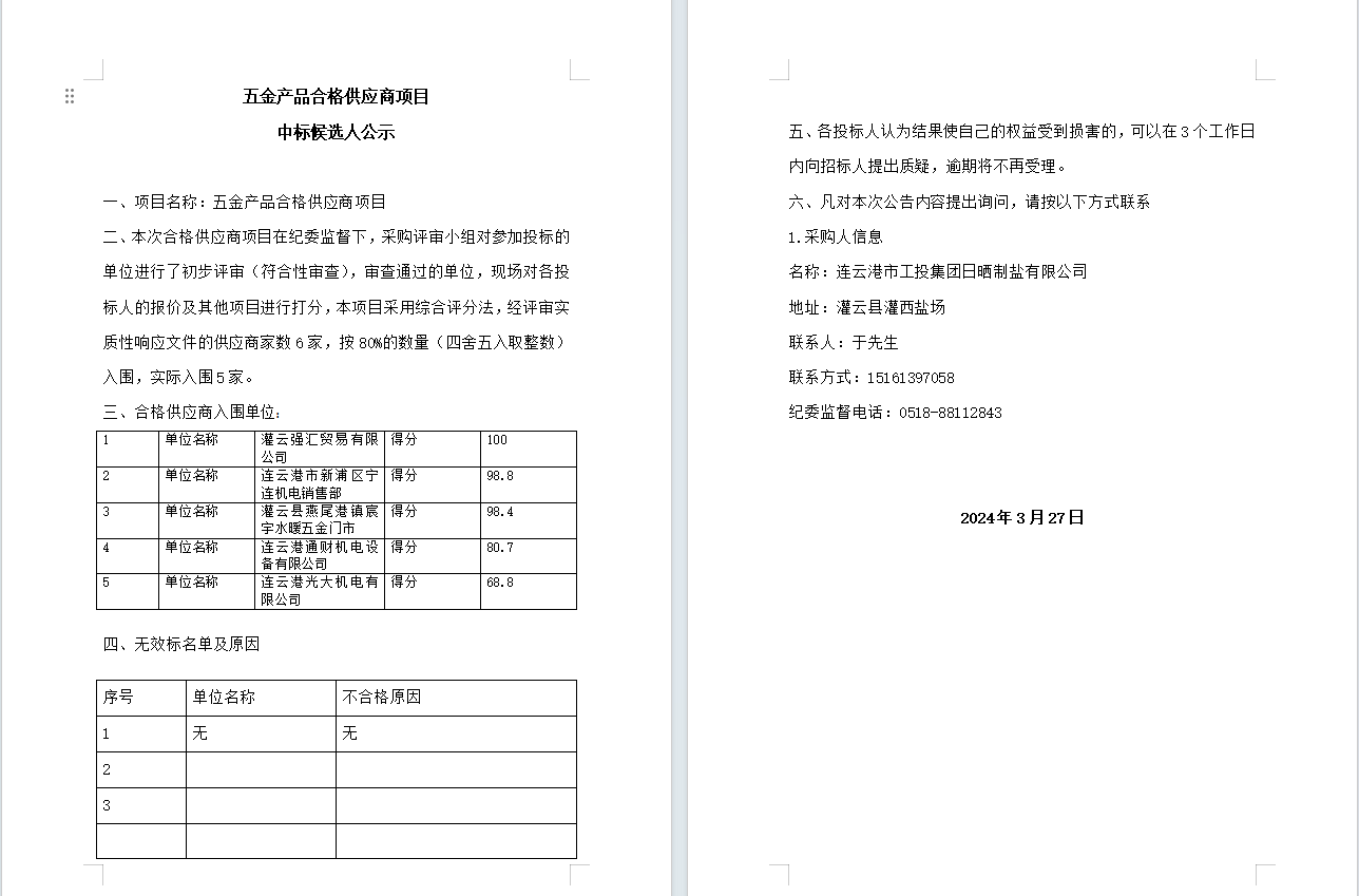 五金產品合格供應商項目中標候選人公示