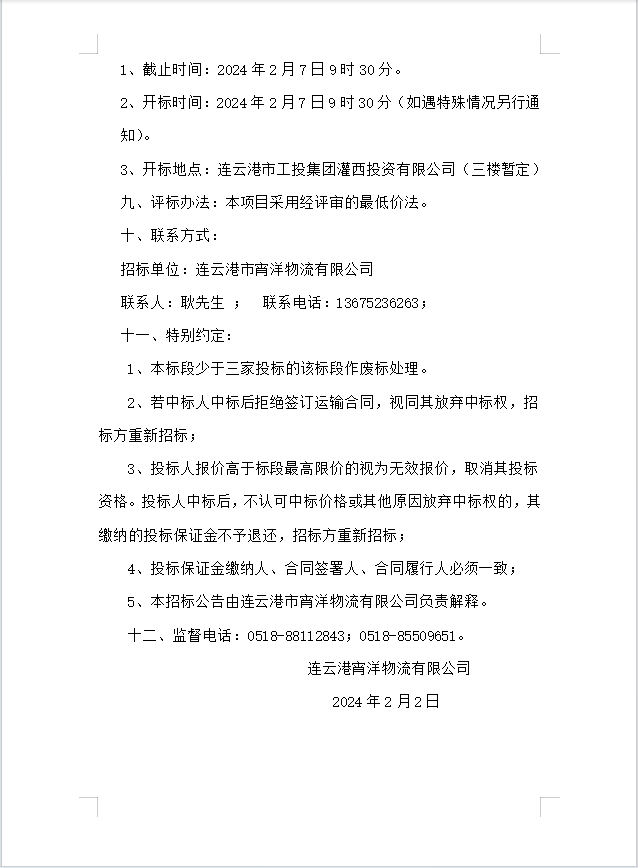 連云港宵洋物流有限公司船舶運輸服務業務招標公告