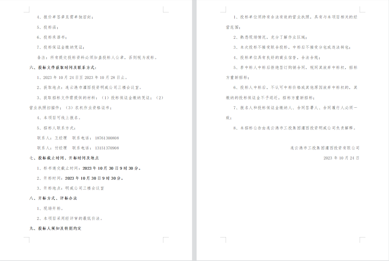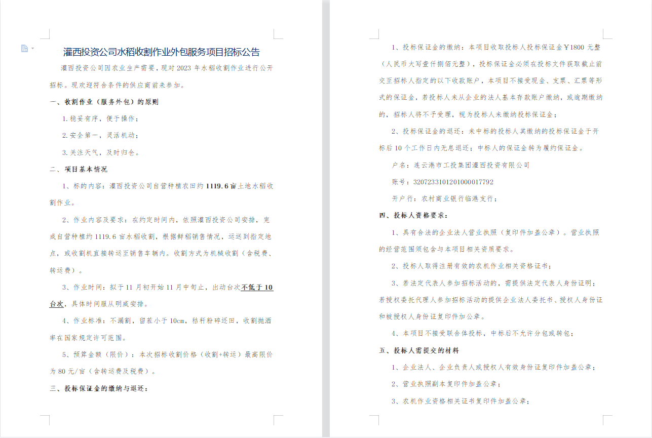 灌西投資公司水稻收割作業外包服務項目招標公告