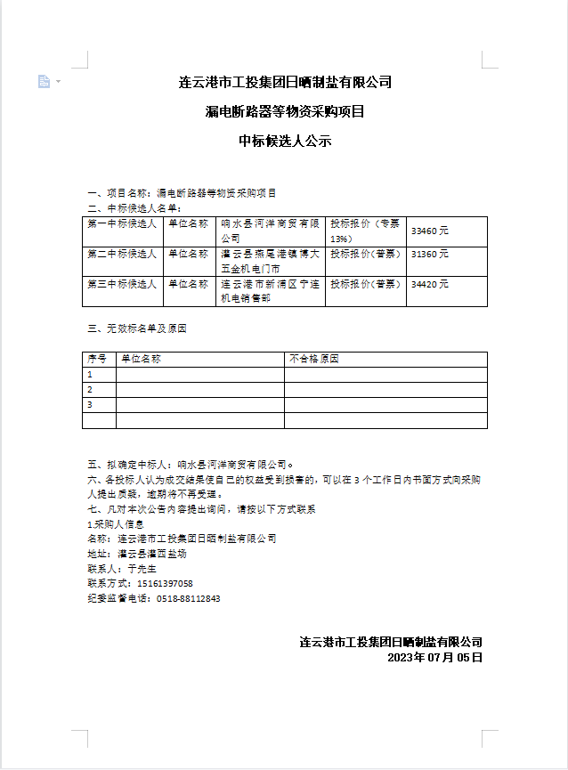 連云港市工投集團日曬制鹽有限公司漏電斷路器等物資采購項目中標候選人公示