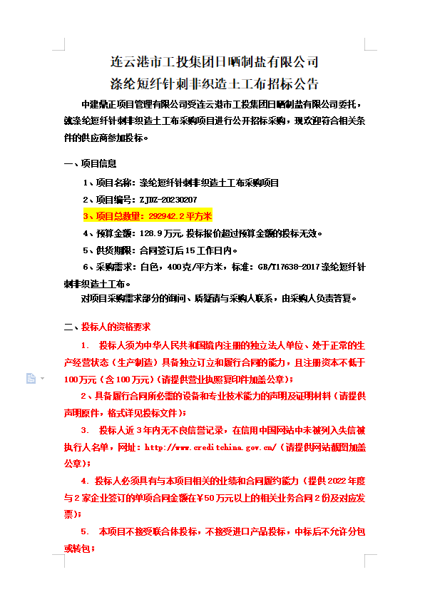 連云港市工投集團日曬制鹽有限公司滌綸短纖針刺非織造土工布招標公告