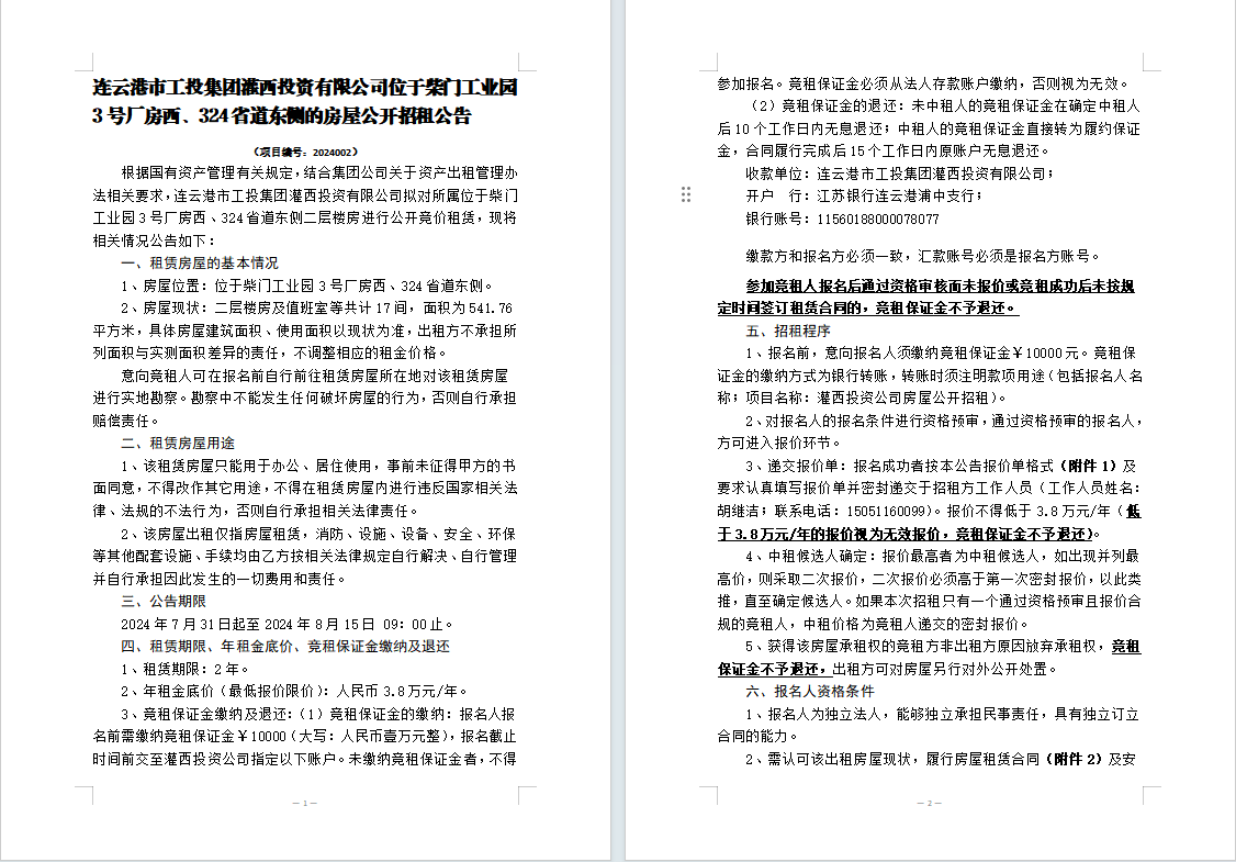 連云港市工投集團灌西投資有限公司位于柴門工業園3號廠房西、324省道東側的房屋公開招租公告