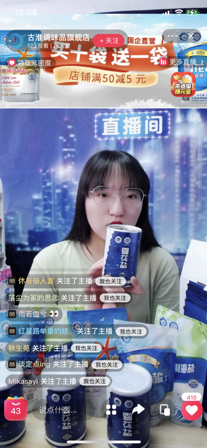 下午3:00,直播正式開始。主播通過網絡平臺向粉絲們在線介紹了金橋制鹽數款產品,其中包括雪花鹽、低鈉鹽、日曬海鹽等諸多品種,與粉絲分享淮鹽文化和知識。在首場直播中,近1000多名粉絲走進直播間圍觀、點贊和下單心儀產品。