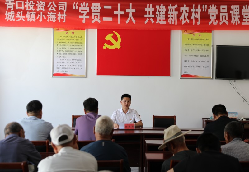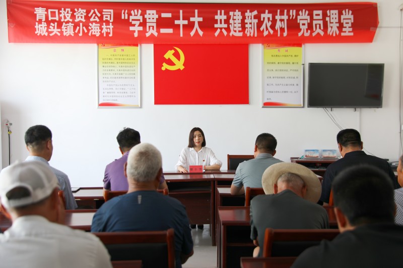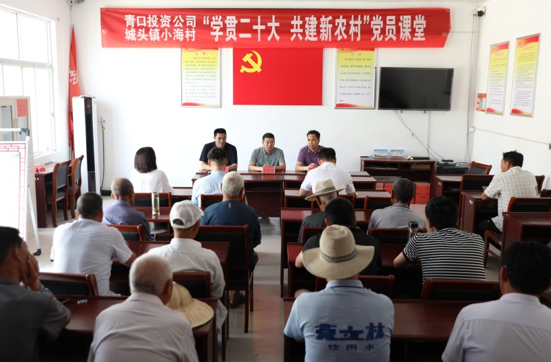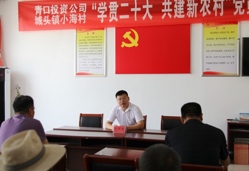 為推動黨的二十大精神在鄉村落地生根,6月28日上午,青口投資公司、城頭鎮小海村聯合開展“學貫二十大 共建新農村”黨員課堂,由公司機關優秀黨務干部組成的二十大精神宣講隊,走進結對共建的贛榆區城頭鎮小海村開展集中式、通俗化宣講。公司黨委副書記、工會主席梁永,城頭鎮副鎮長王延光,城頭鎮小海村支部書記徐坤參加活動。