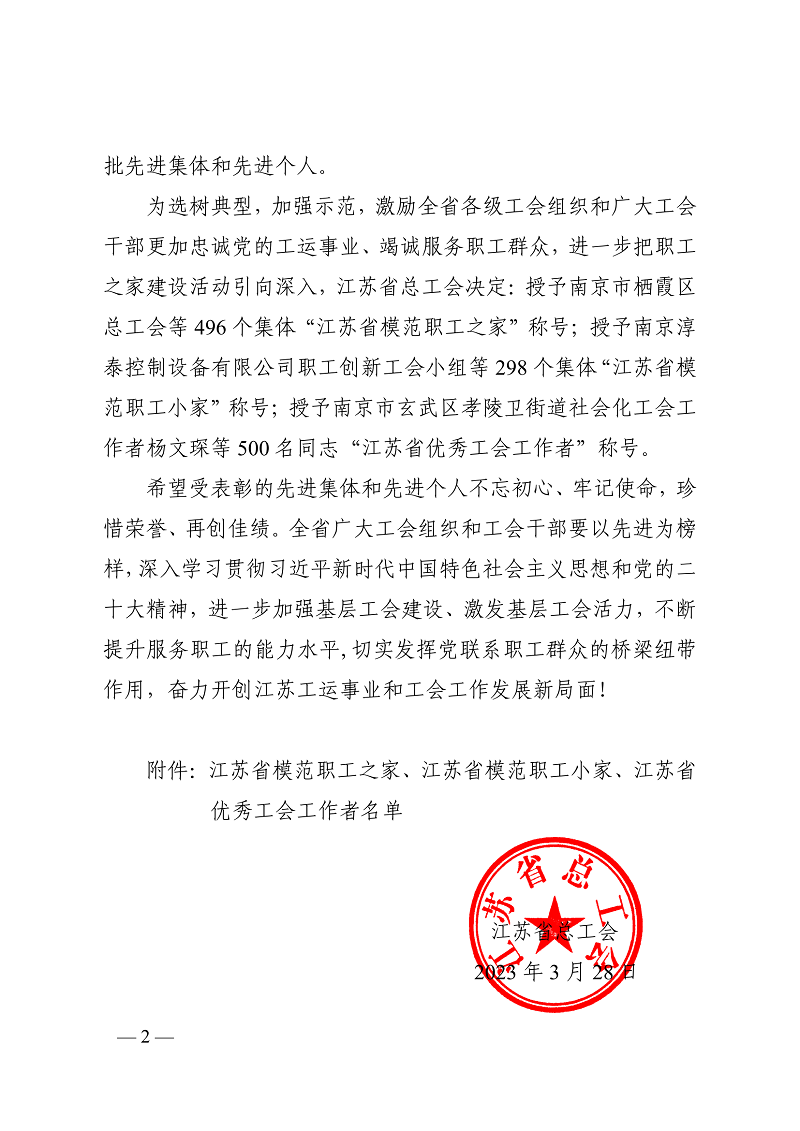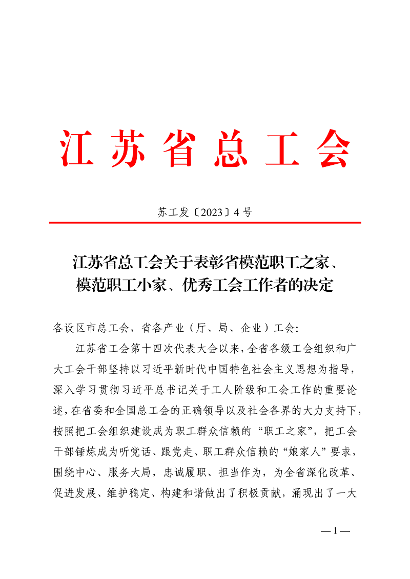 根據《江蘇省總工會關于表彰省模范職工之家、模范職工小家、優秀工會工作者的決定》(蘇工發【2023】4號)文件精神,青口投資公司工會榮獲“江蘇省模范職工之家”稱號。