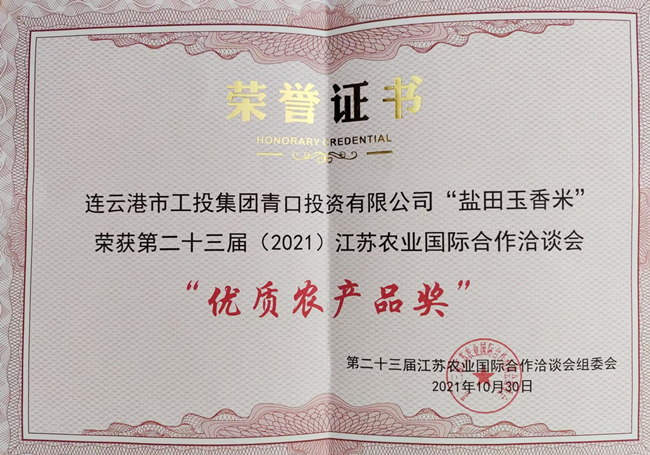 農洽會上,“鹽田玉”大米憑借口感軟糯、營養豐富的口碑優勢,再次得到大會和參展商的好評,并在眾多農產品中脫穎而出,榮獲第二十三屆江蘇農業國際合作洽談會“優質農產品獎”。