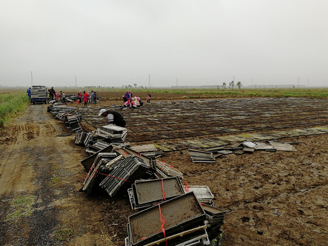五月是水稻育秧落谷的黃金周期,大新農場搶抓農時迅速行動,育秧工作全面鋪開,田頭播地龍和暗化育秧同時進行。54日,一分場四隊率先暗化秧擺盤,條田工自發組織“運秧”車隊,將大棚暗化秧盤運至田頭進行擺盤。截止目前,自營農田育秧已播156700盤。(大新農場)