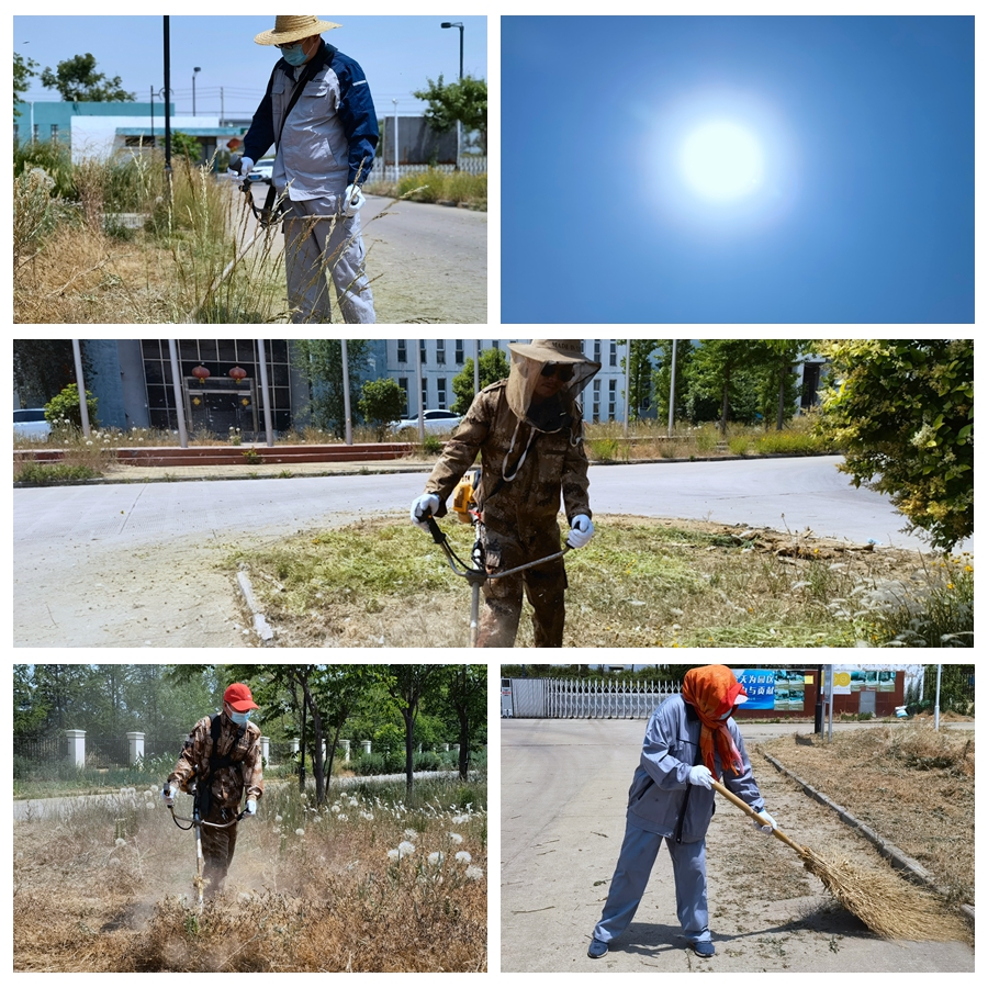 頭頂著炎炎烈日、忍受著蚊蟲叮咬,大伙使用打草機、鐮刀等工具,對雜草、高草進行割除。走近細看,他們的臉上和手臂上都布滿,衣服早已濕透貼在身上。除草過程中,草渣紛紛濺到他們的身上,但這絲毫沒能影響他們工作的節奏。伴隨著機器的轟鳴聲,一片片規格一致、邊緣平直的綠草坪映入眼簾,淡淡的清香綠草味撲鼻而來,整個綠地充斥著整潔的氣息。
