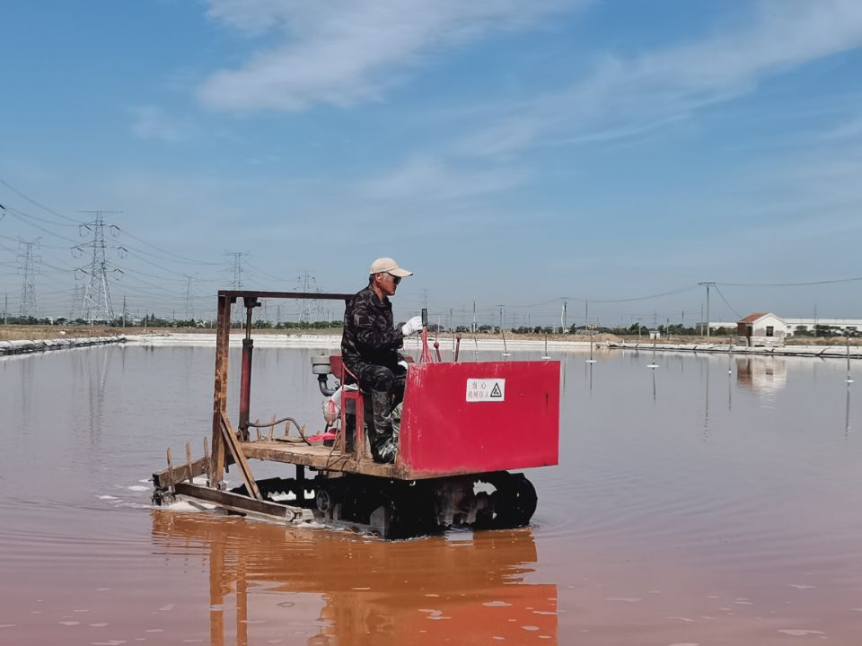 此時的鹽層大約已有五六厘米厚,若想長出晶瑩剔透的大顆粒晶體鹽,活碴作業是必不可少的。每日清晨6點,昌圩班組、先鋒班組、大浦班組準時有一名工人駕駛活碴機,對鹽池板進行破碎翻動,保持鹽層的疏松和顆粒間一定的間隙,確保晶體長得既快又好。通過活碴,鹽顆粒散亂在池底,經過陽光照射會產生不規則的反射,大大減少了光線反射回水面的概率,易于提高鹵水溫度,增大鹵水蒸發量,從而增加原鹽的產量。