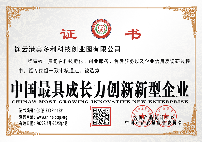近期,美多利公司科技孵化、創業服務等工作通過中國產品質量監督委員會專家評審認定,榮獲中國最具成長力創新新型企業。